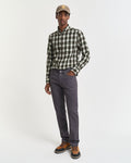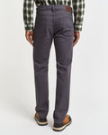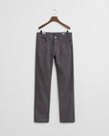 Following a classic and timeless style, this jean is cut with a mid-rise waist and a regular fit that's slim over the hip and straight at the knee and leg. Crafted from a soft brushed twill fabric with comfort stretch, these jeans have a 5-pocket design, branded shank buttons and rivets, a zip fly and a leather GANT logo patch at the back.